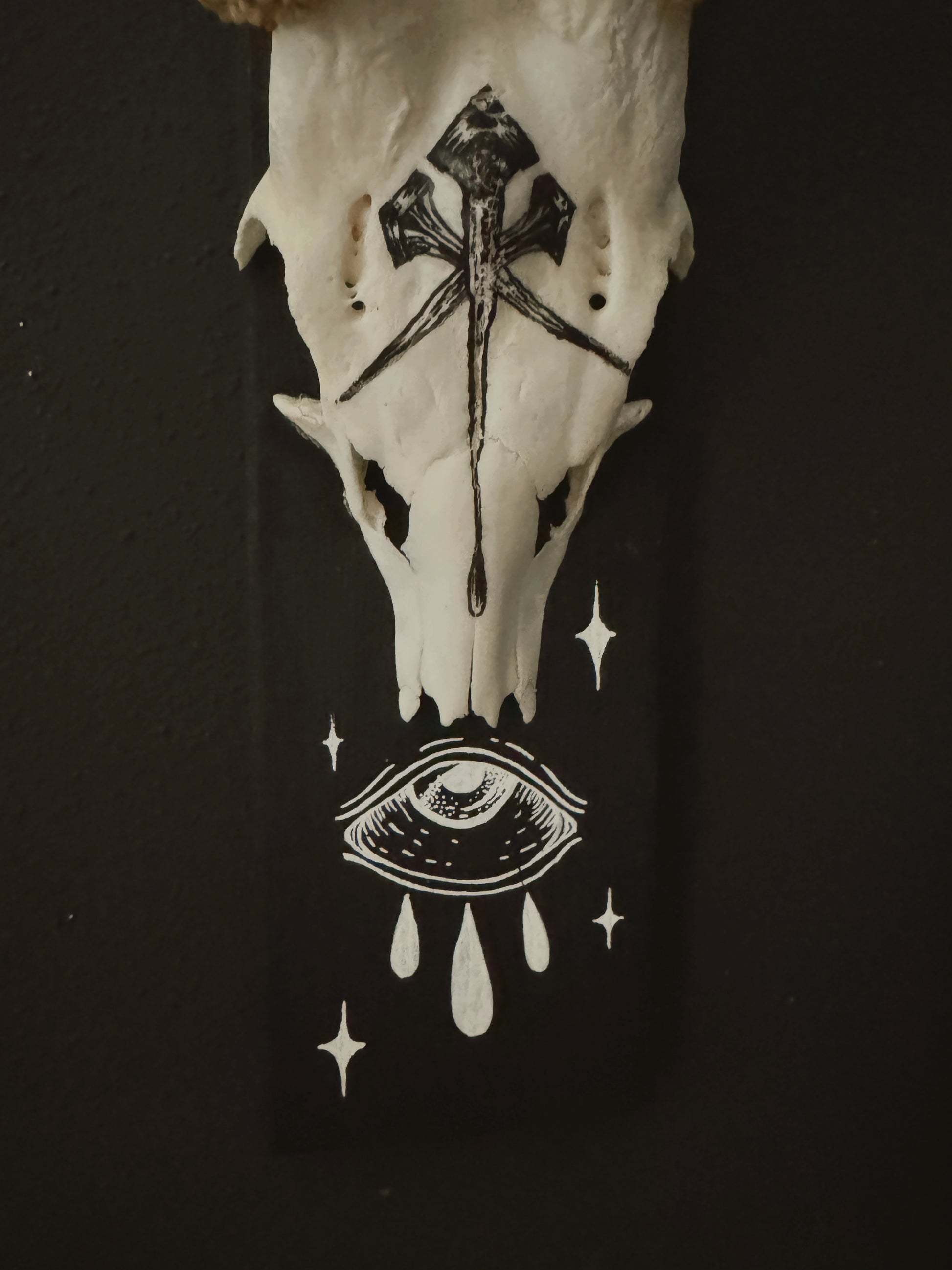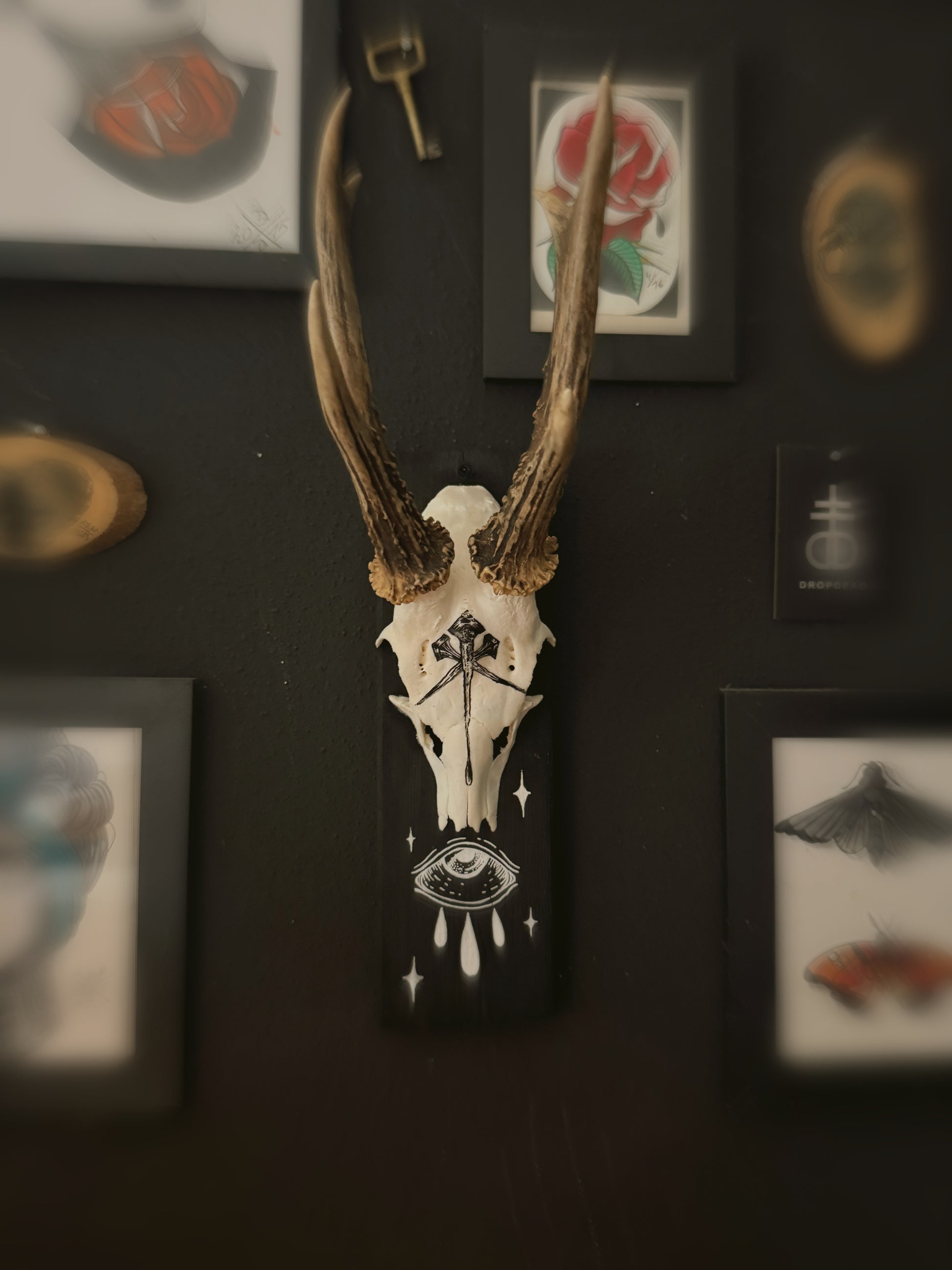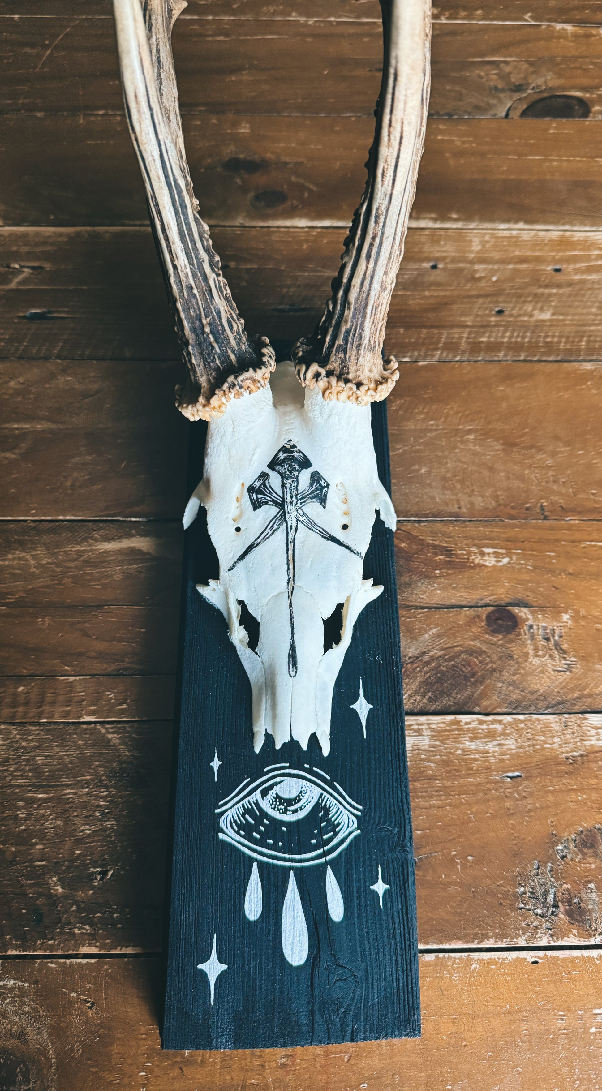 Dieser originale Rehbockschädel wurde auf einer schwarzen Holzplatte befestigt und mit mystischen Symbolen von Hand bemalt – darunter ein Auge und Sterne, die für Schutz, Klarheit und spirituelle Tiefe stehen.