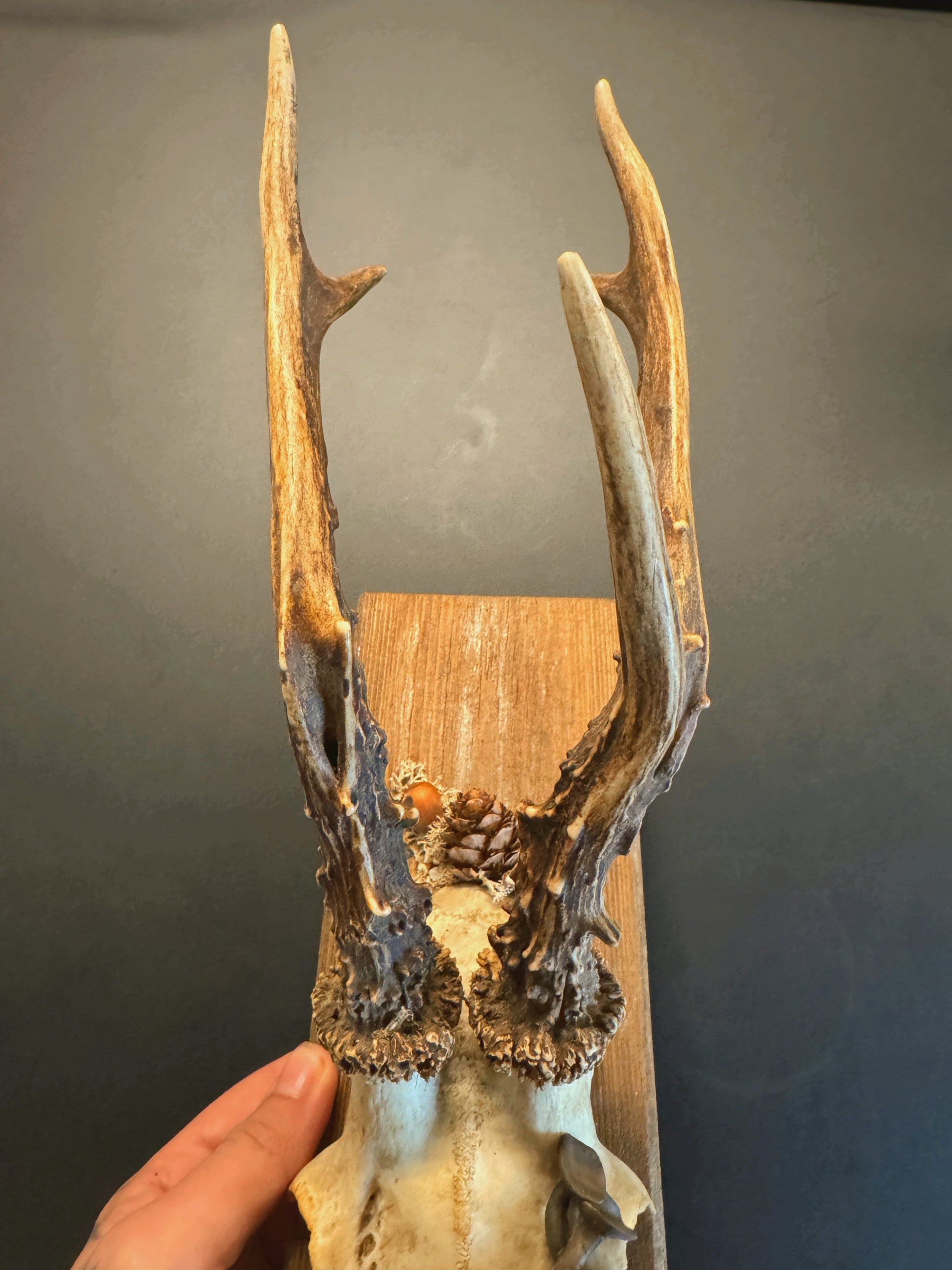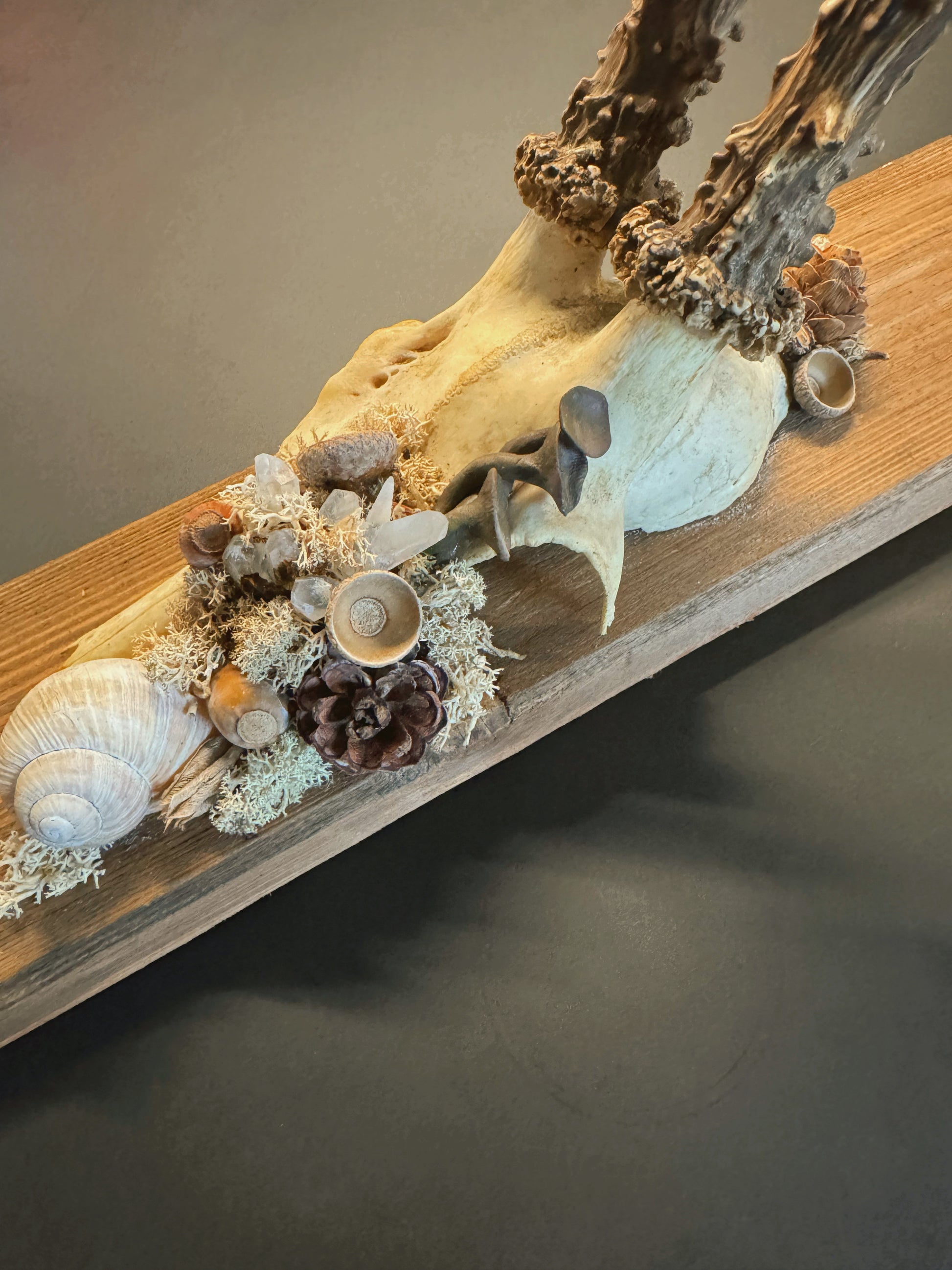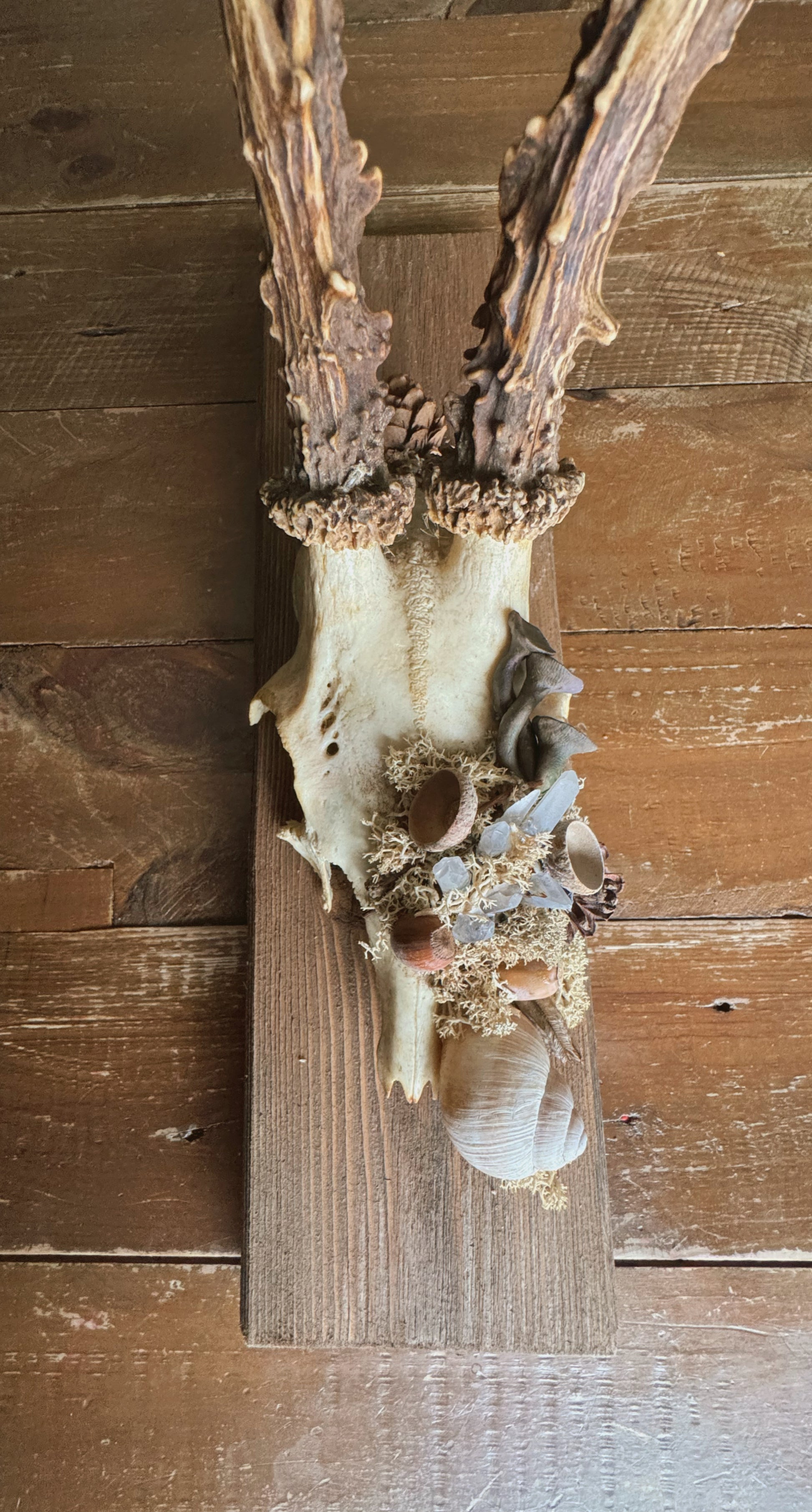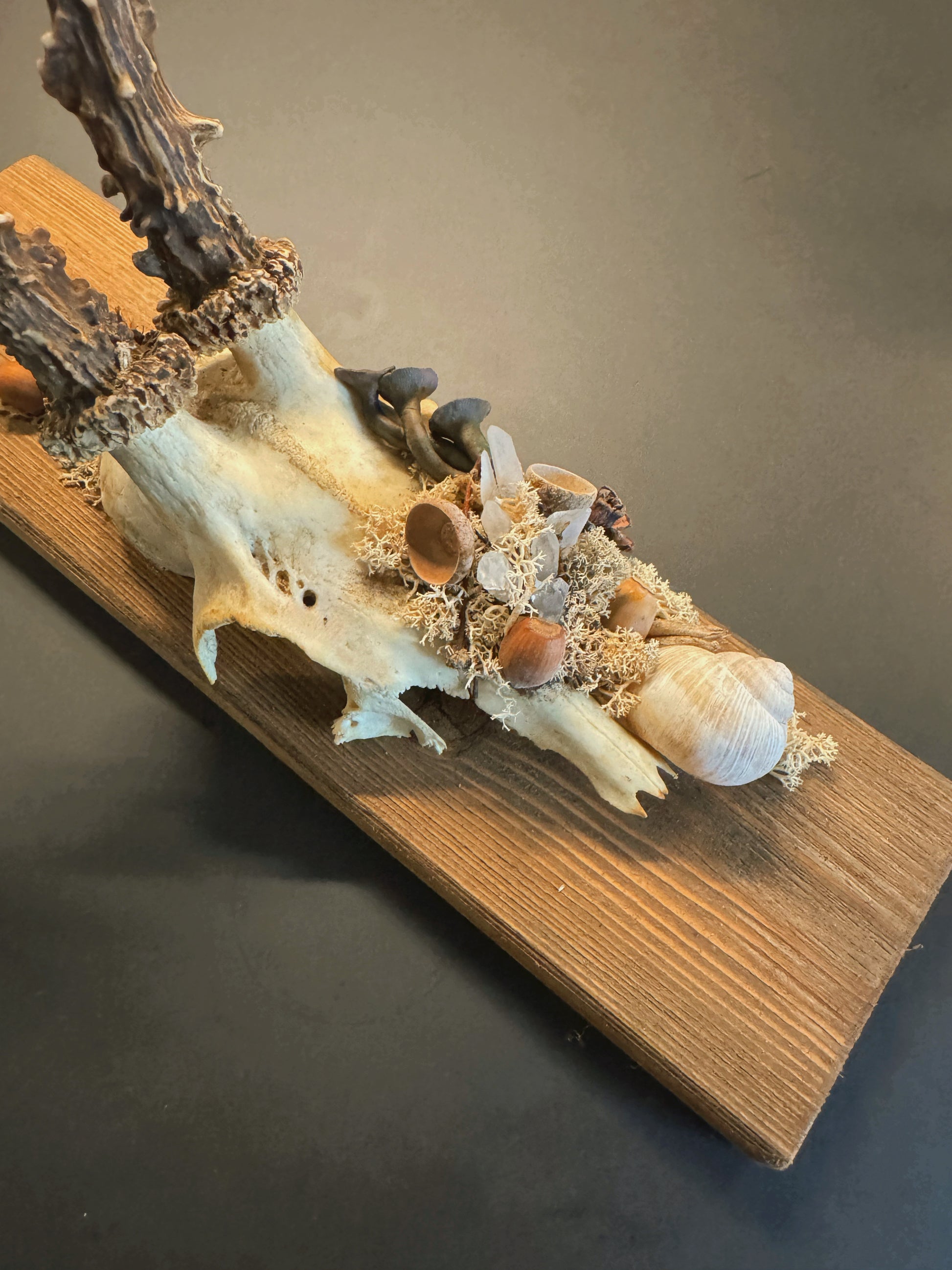 Dieses kunstvolle Einzelstück vereint die wilde Schönheit der Natur mit feinen Details: ein originaler Rehbockschädel, liebevoll auf einer Holzplatte arrangiert und mit Naturmaterialien wie Zapfen, Moos und Kristallen (Lemurienquarz) veredelt.
