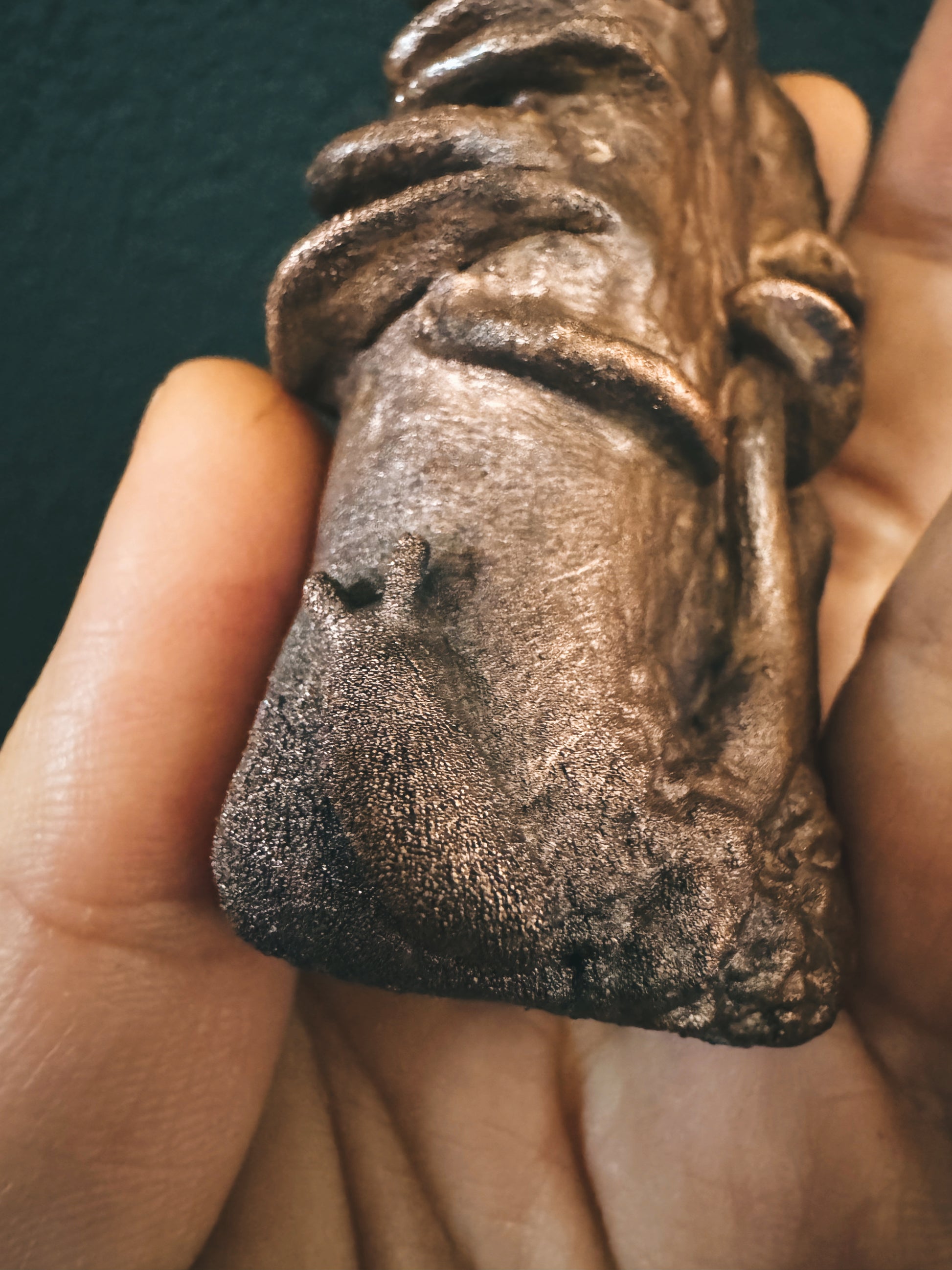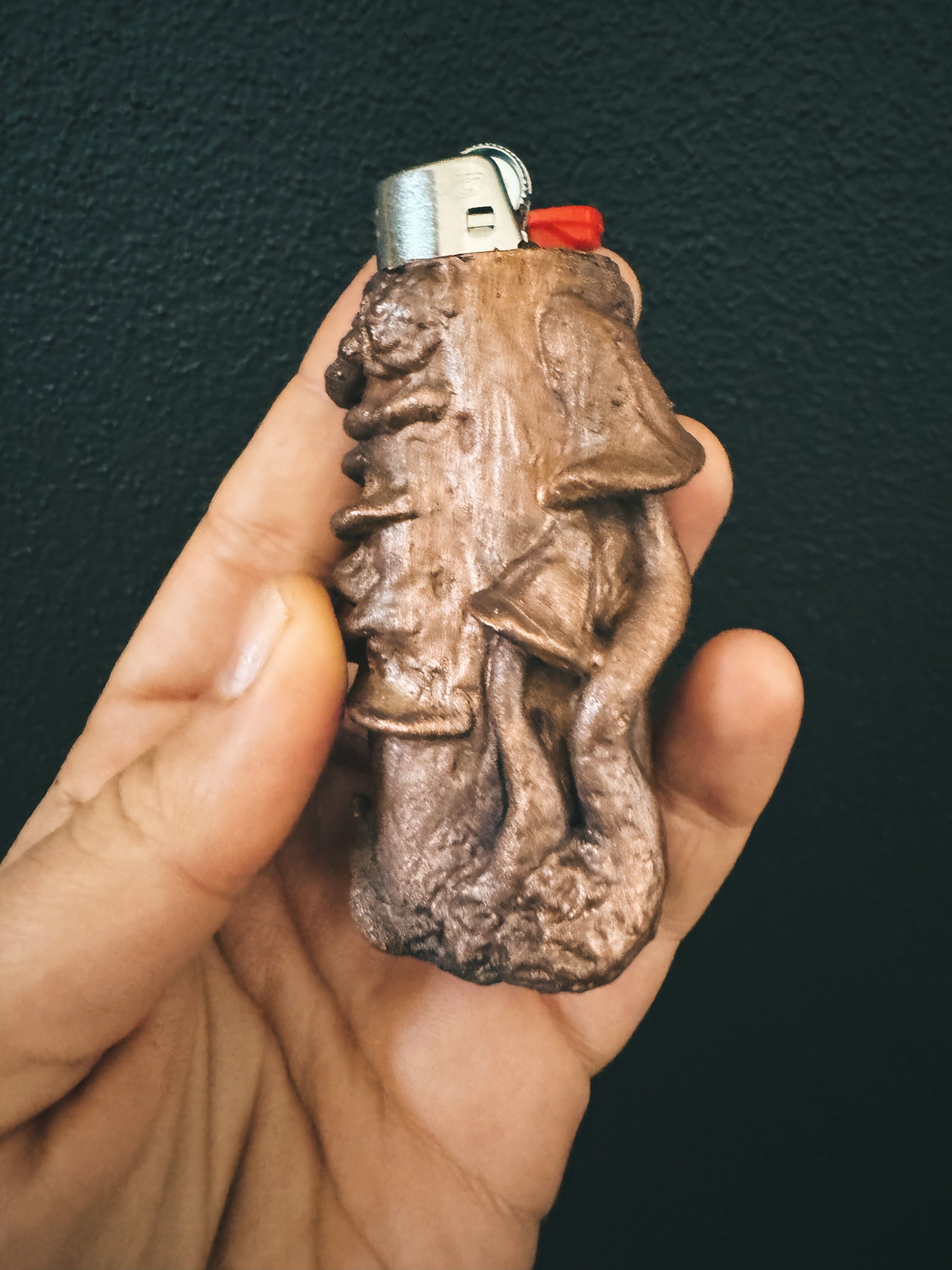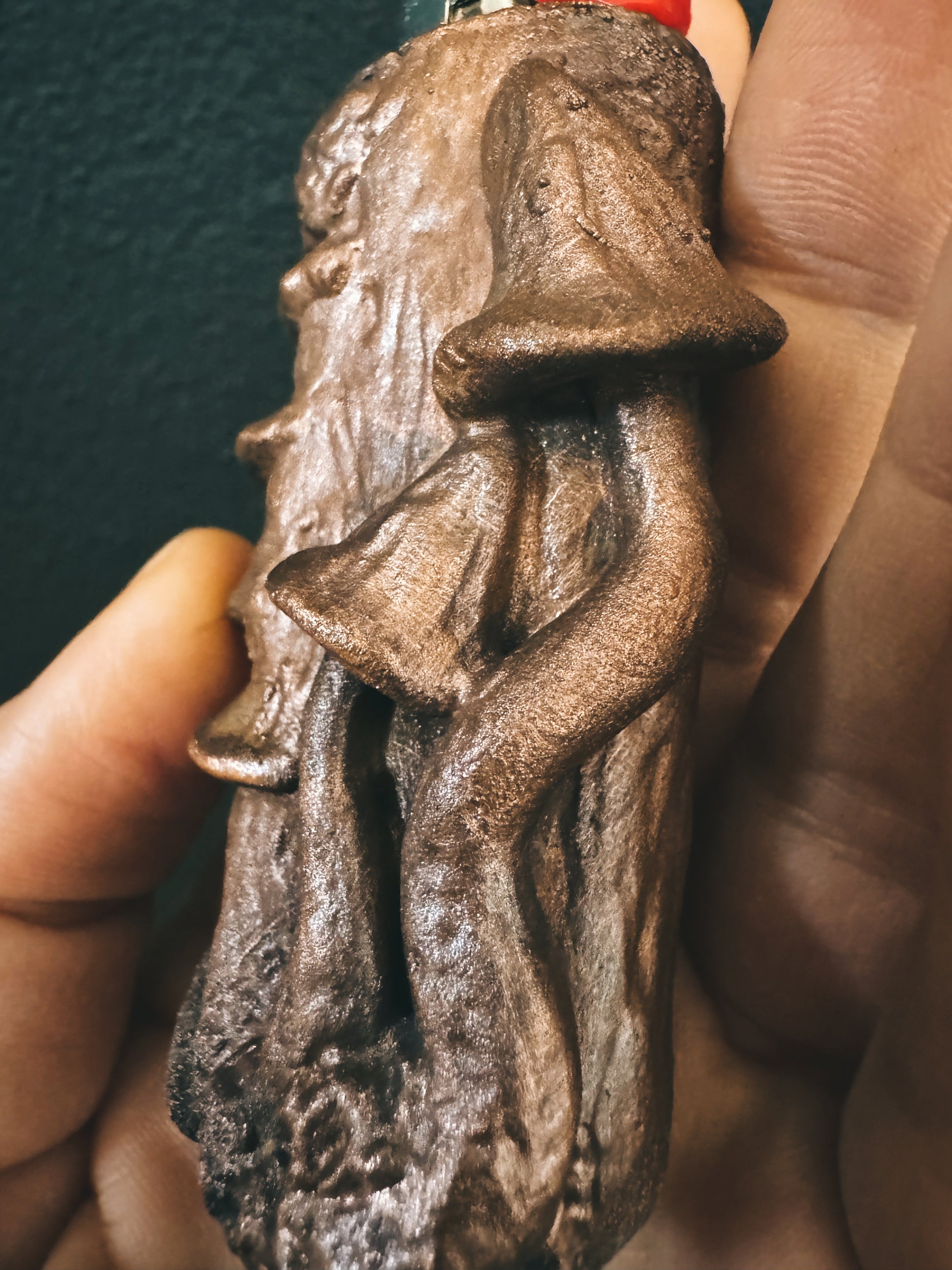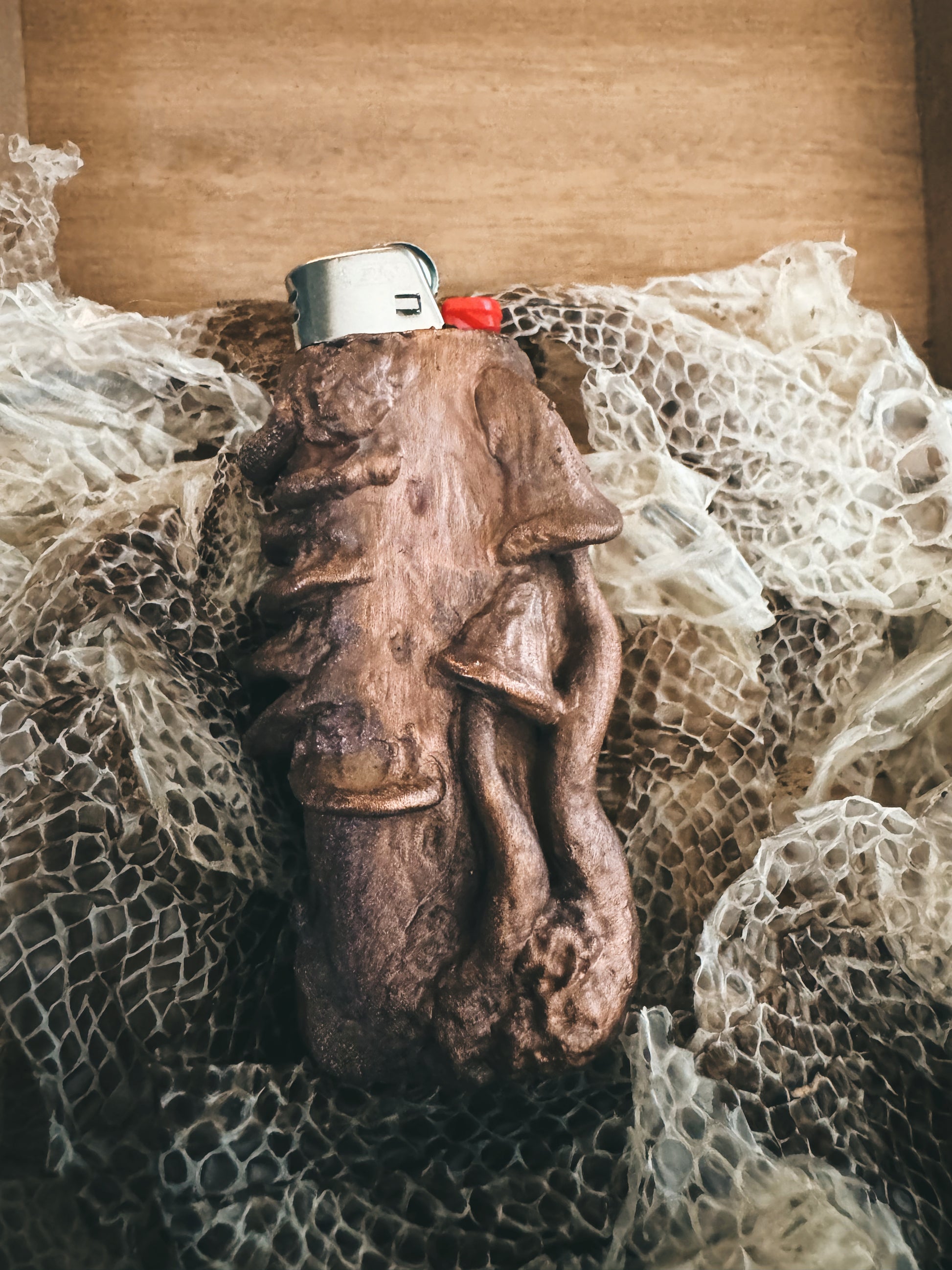 Diese Feuerzeughülle trägt die Spuren eines uralten Waldes – verwachsene Pilze, knorrige Formen und eine mystische Tiefe, die an verwunschene Lichtungen erinnert. Jedes Exemplar wird einzeln von mir per Hand modelliert, mit echtem Kupfer überzogen und zu einem kleinen Altarstück verwandelt.