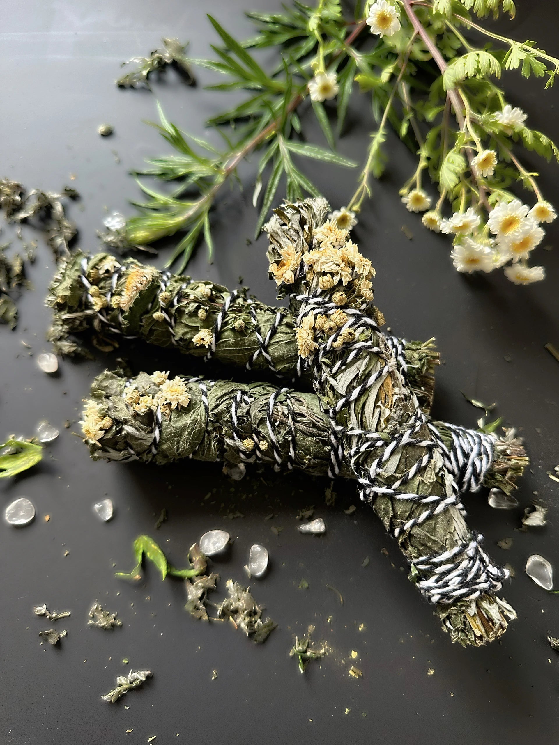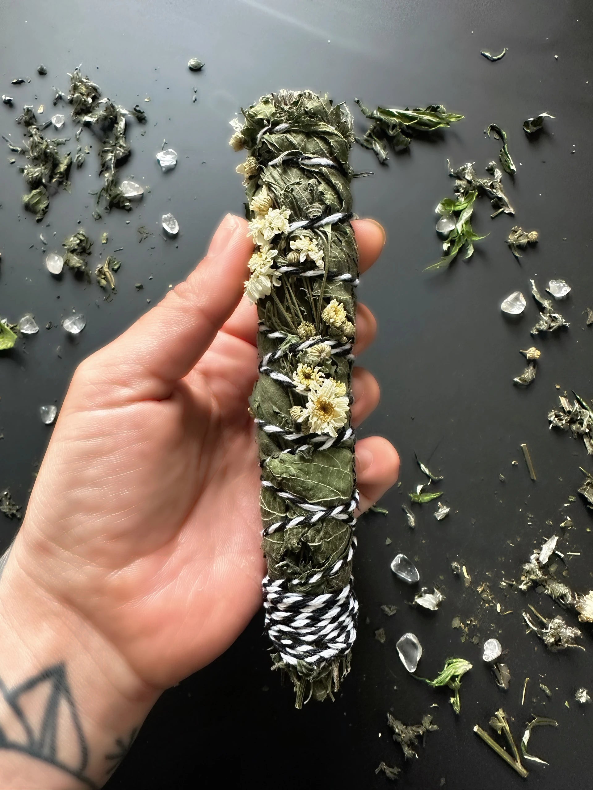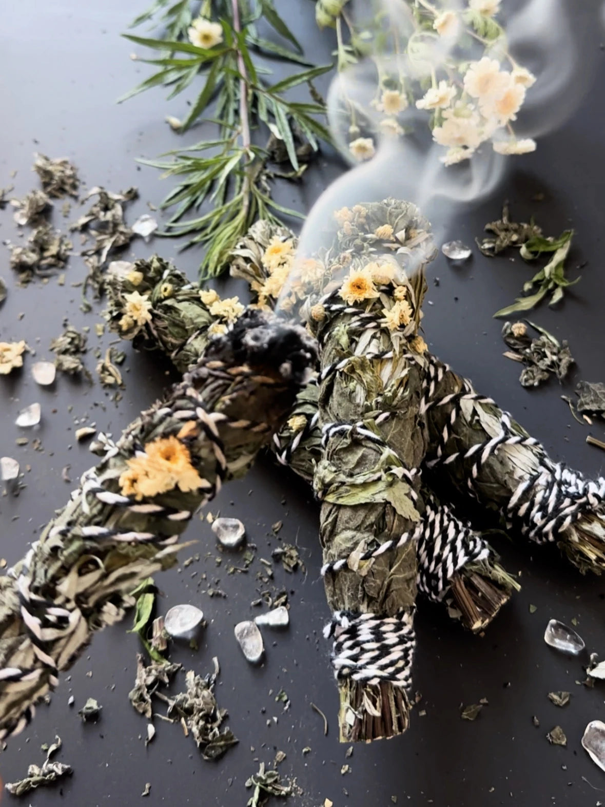 Tipp: Da die heimischen Kräuter nicht so harzig sind, kann es vorkommen, dass sie nicht richtig glimmen und schnell wieder ausgehen. Sollte das Bündel nicht richtig rauchen oder zu schnell wieder ausgehen, lockere das Bündel oben mit einem Stäbchen und gebe etwas pulverisiertes Fichtenharz zwischen die trockenen Stängel und entzünde das Bündel erneut. Zwischendurch immer wieder Luft zu pusten, damit genügend Glut entsteht und das Bündel nicht ausgeht.